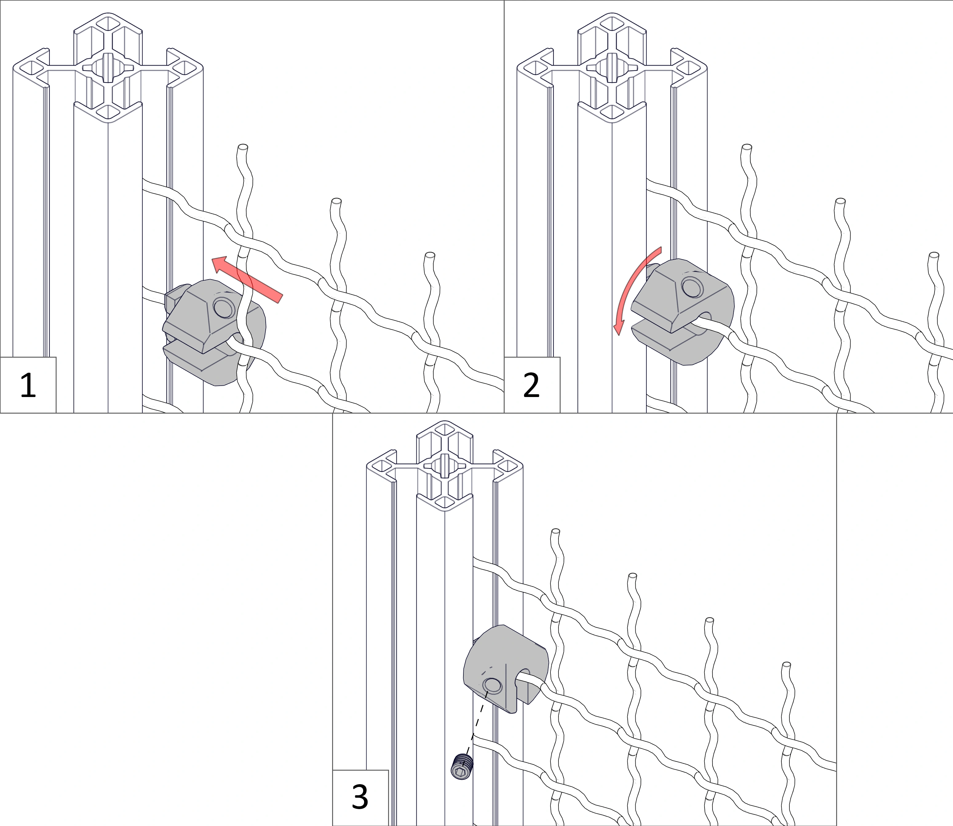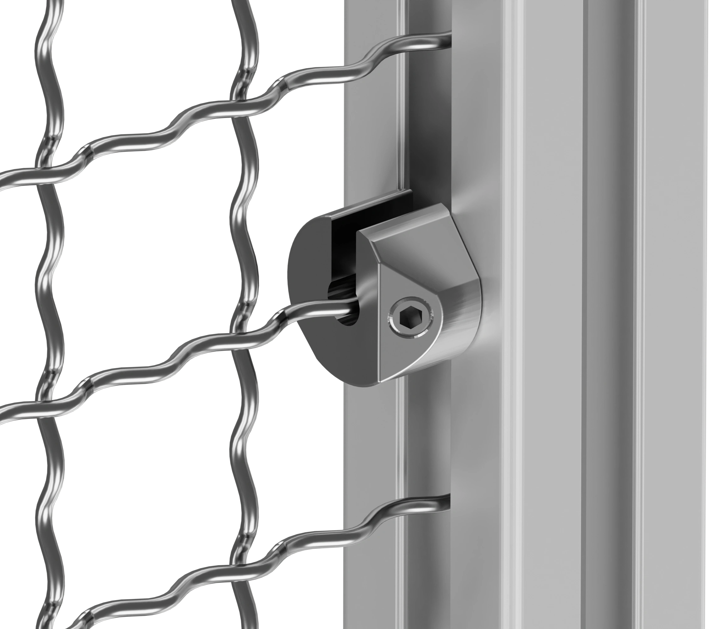 Устанавливается путем заведения в паз профиля с торца. Установочный винт, входящий в комплект изделия надежно фиксирует сетку, и при необходимости позволяет демонтировать.