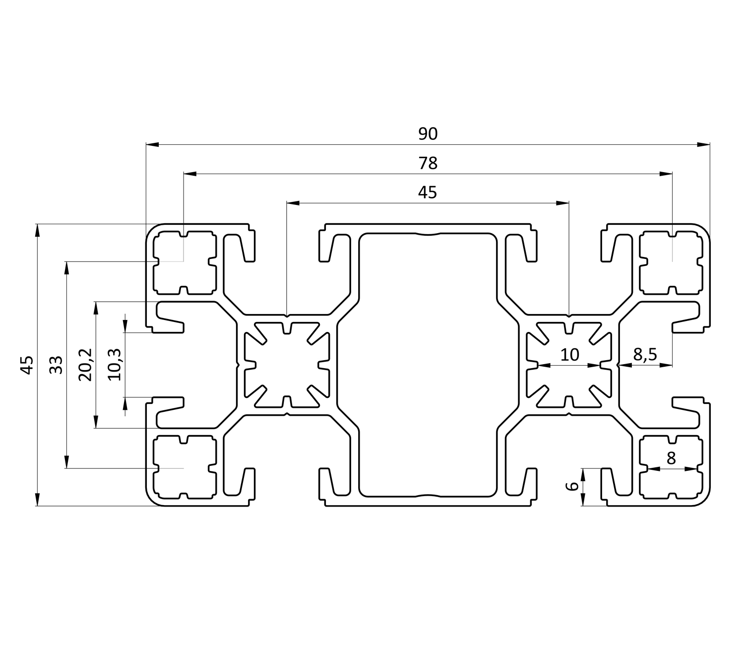 Алюминиевый конструкционный профиль 45х90SL анодированныйАлюминиевый конструкционный профиль 45х90SL анодированный