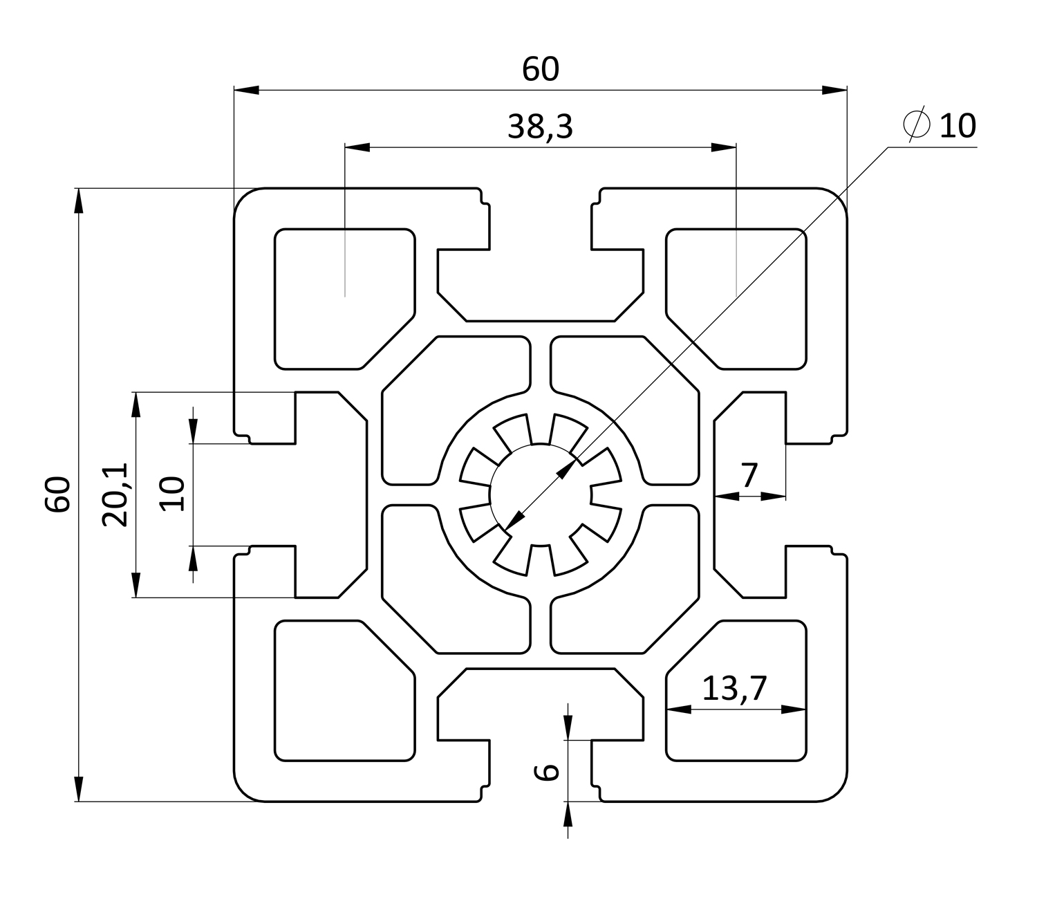 Алюминиевый конструкционный профиль 60х60 усиленный анодированныйАлюминиевый конструкционный профиль 60х60 усиленный анодированный