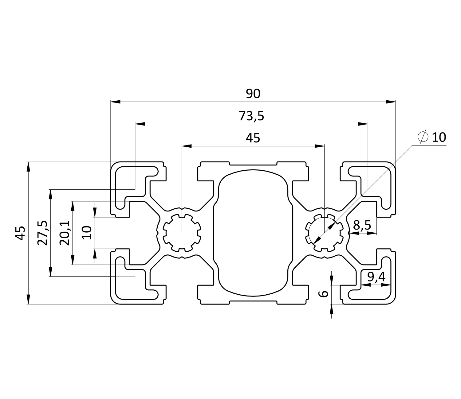 Алюминиевый конструкционный профиль 45х90 без покрытияАлюминиевый конструкционный профиль 45х90 без покрытия