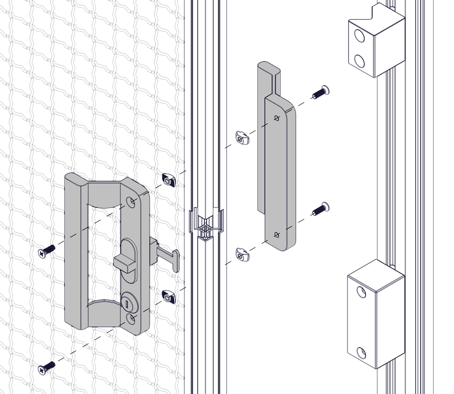 Основной корпус замка устанавливается в положении слева посредством врезки в конструкционный алюминиевый профиль. Ответная часть замка устанавливается непосредственно поверх профиля.