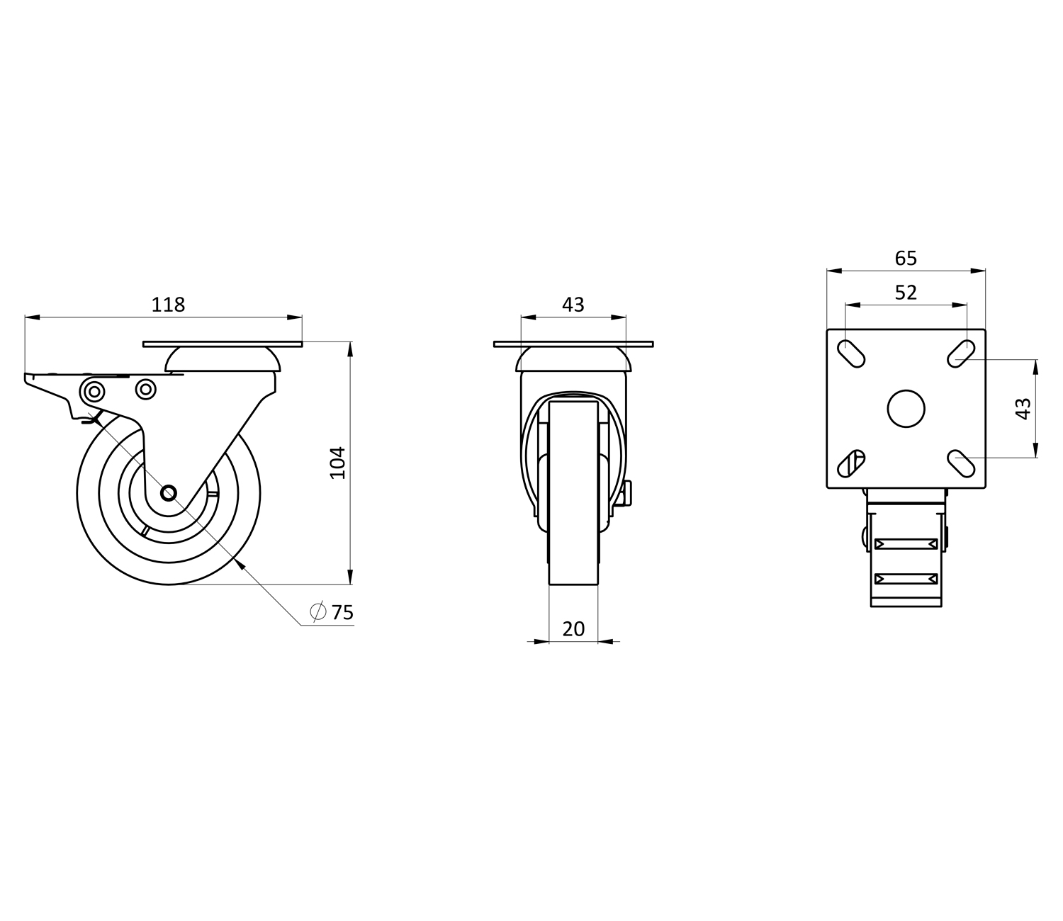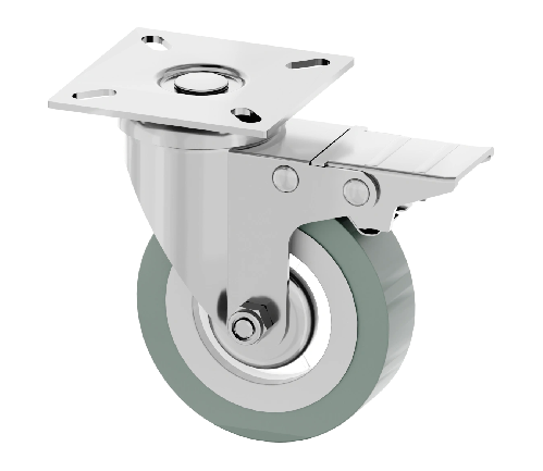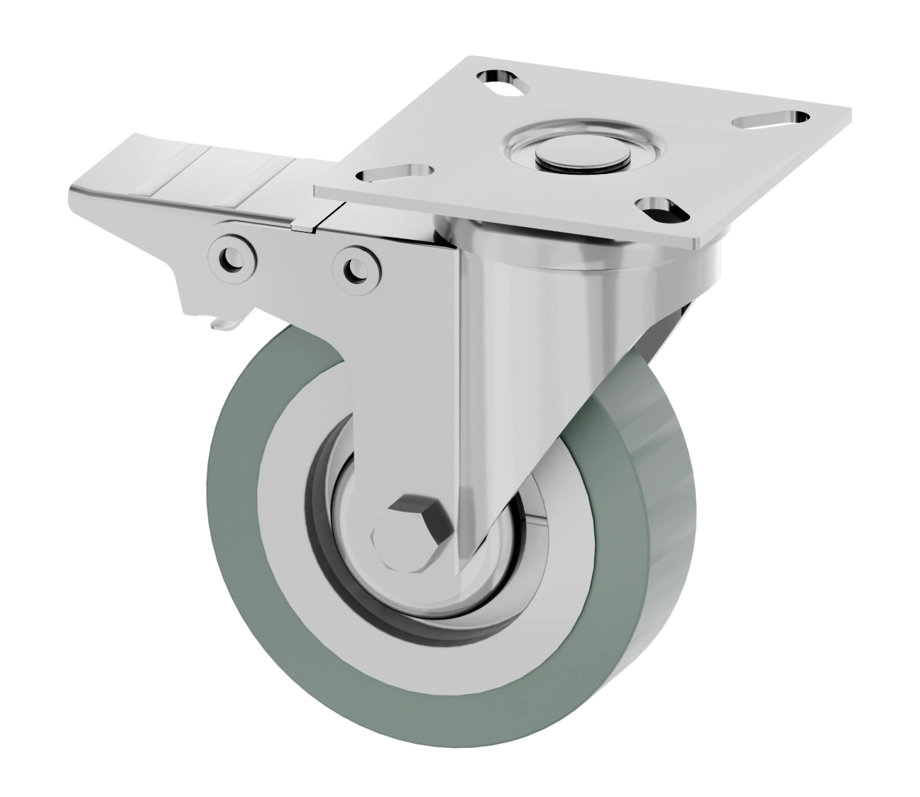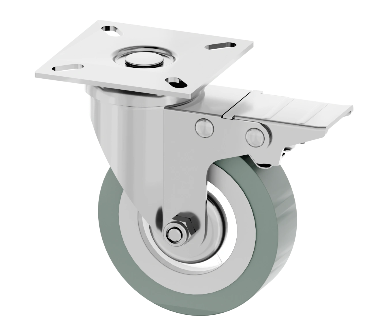Поворотный ролик с тормозом низкой грузоподъемности с платформой. Обод ролика имеет боковые пыльники, защищающих осевой механизм. Благодаря термопластичному контактному слою, не оставляют следов на поверхности пола. Используется при производстве конструкций из алюминиевого профиля, которые должны обладать возможностью перемещения их в пространстве, такие как промышленная и рабочая мебель, тележки, различные агрегаты, торговое оборудование