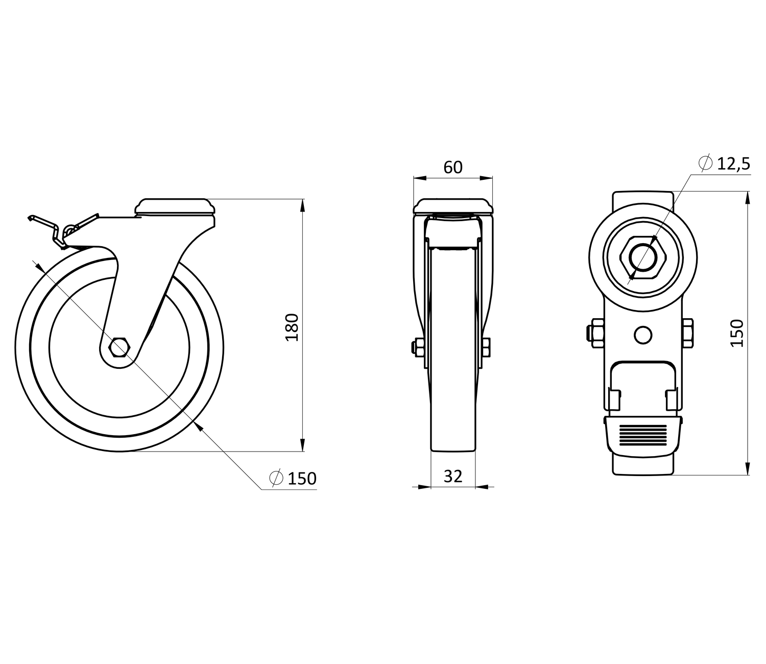 Колесо поворотное с тормозом 150 мм, черноеКолесо поворотное с тормозом 150 мм, черное