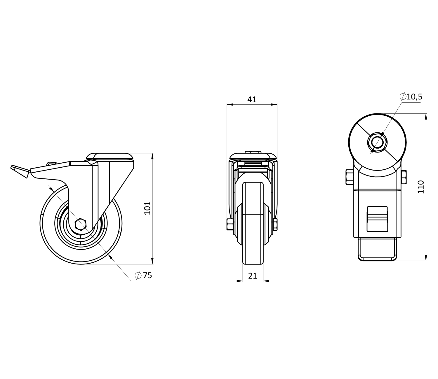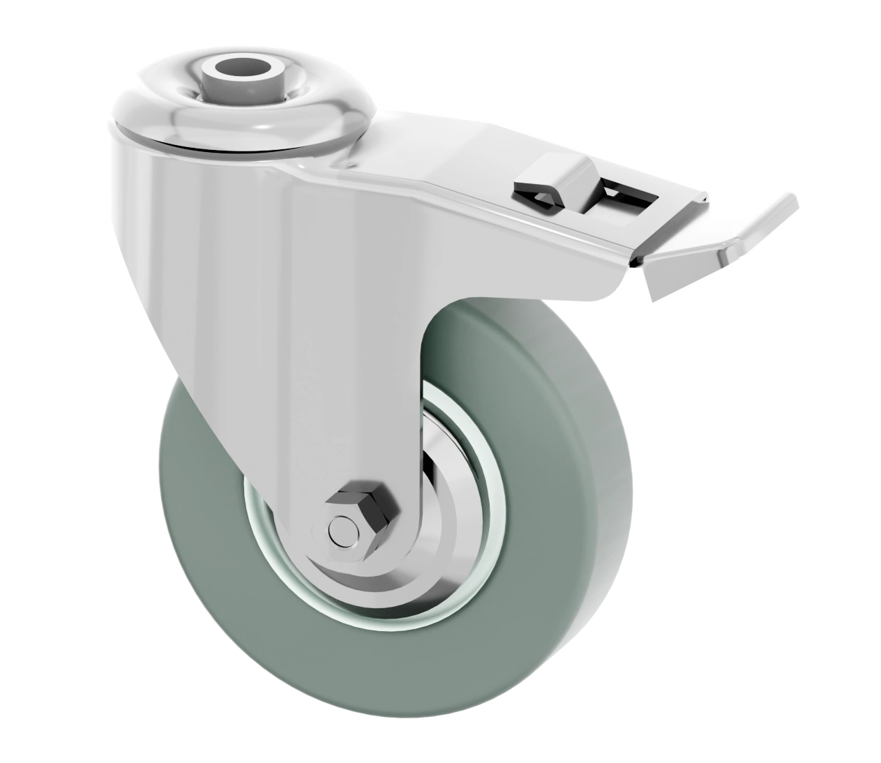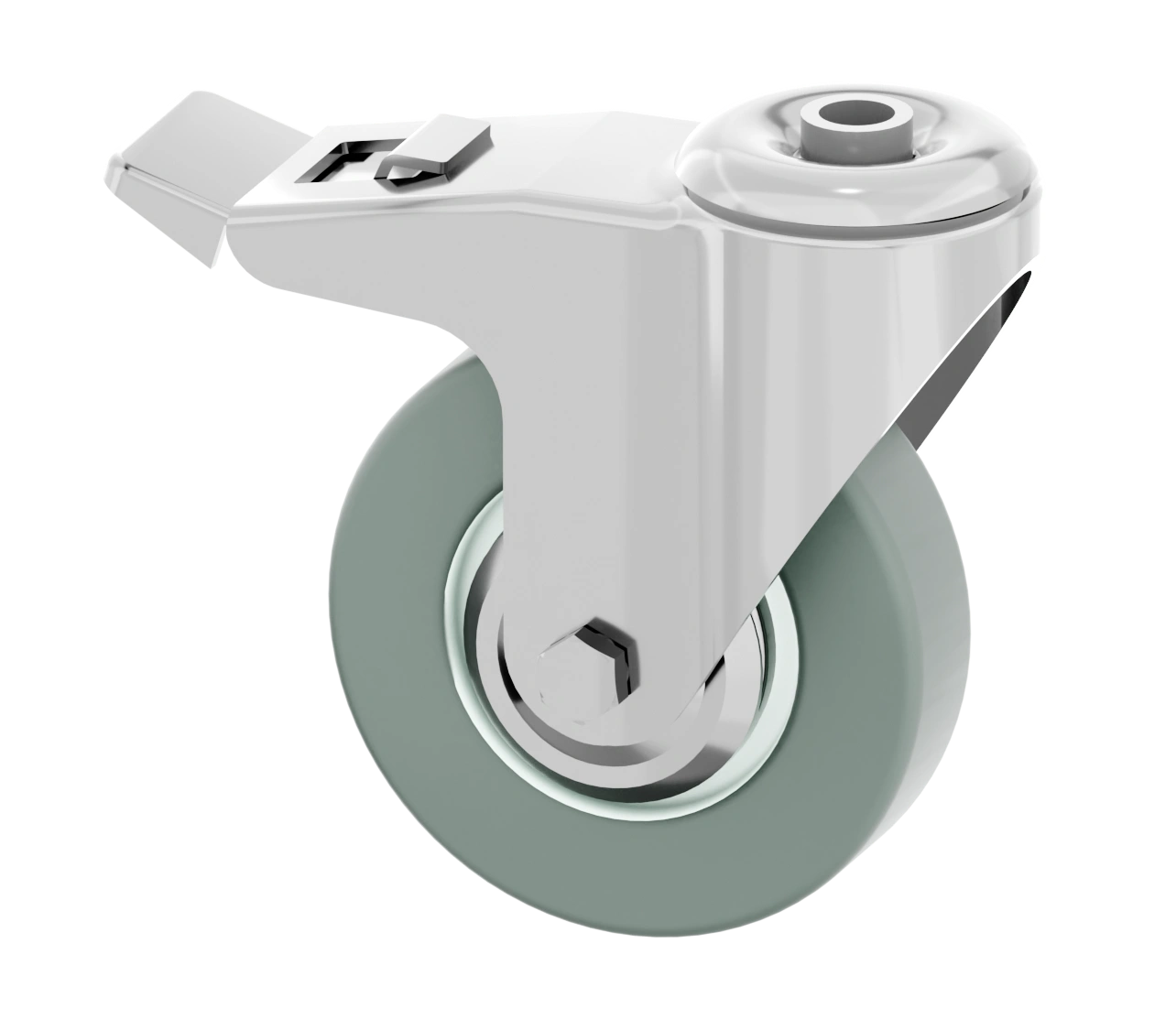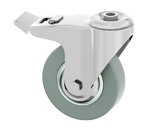 Ролик поворотный низкой грузоподъемностью с тормозом, имеет болтовое крепление. Используется при производстве конструкций из алюминиевого профиля, которые должны обладать возможностью перемещения их в пространстве, такие как промышленная и рабочая мебель, медицинское оборудование и мебель, различные агрегаты, тележки, торговое оборудование.