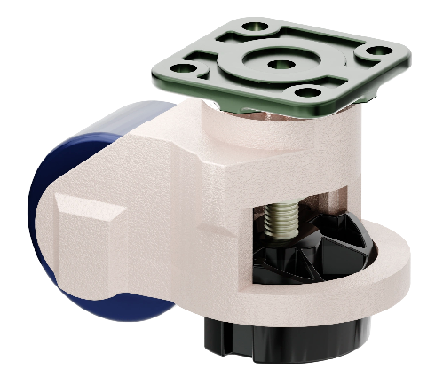 Поворотный ролик диаметром 72 мм с опорой. Кронштейн изготовлен методом литья из сплава алюминия с порошковой окраской бежевого цвета. Фиксирующая опора выполнена из твердой резины. Применяется при производстве специализированного оборудования со специальными требованиями выставления конструкции по высоте. Выставление высоты производится сзади при помощи встроенного регулировочного колесика. Легкий ход обеспечен материалу ролика при движении на гладкой поверхности пола