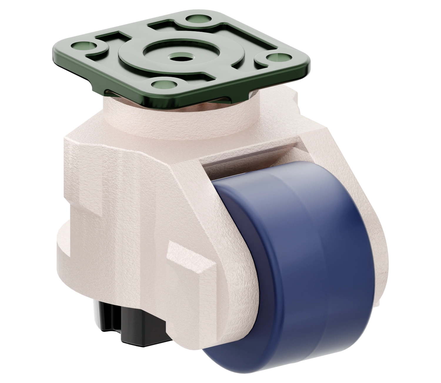 Поворотный ролик диаметром 72 мм с опорой. Кронштейн изготовлен методом литья из сплава алюминия с порошковой окраской бежевого цвета. Фиксирующая опора выполнена из твердой резины. Применяется при производстве специализированного оборудования со специальными требованиями выставления конструкции по высоте. Выставление высоты производится сзади при помощи встроенного регулировочного колесика. Легкий ход обеспечен материалу ролика при движении на гладкой поверхности пола