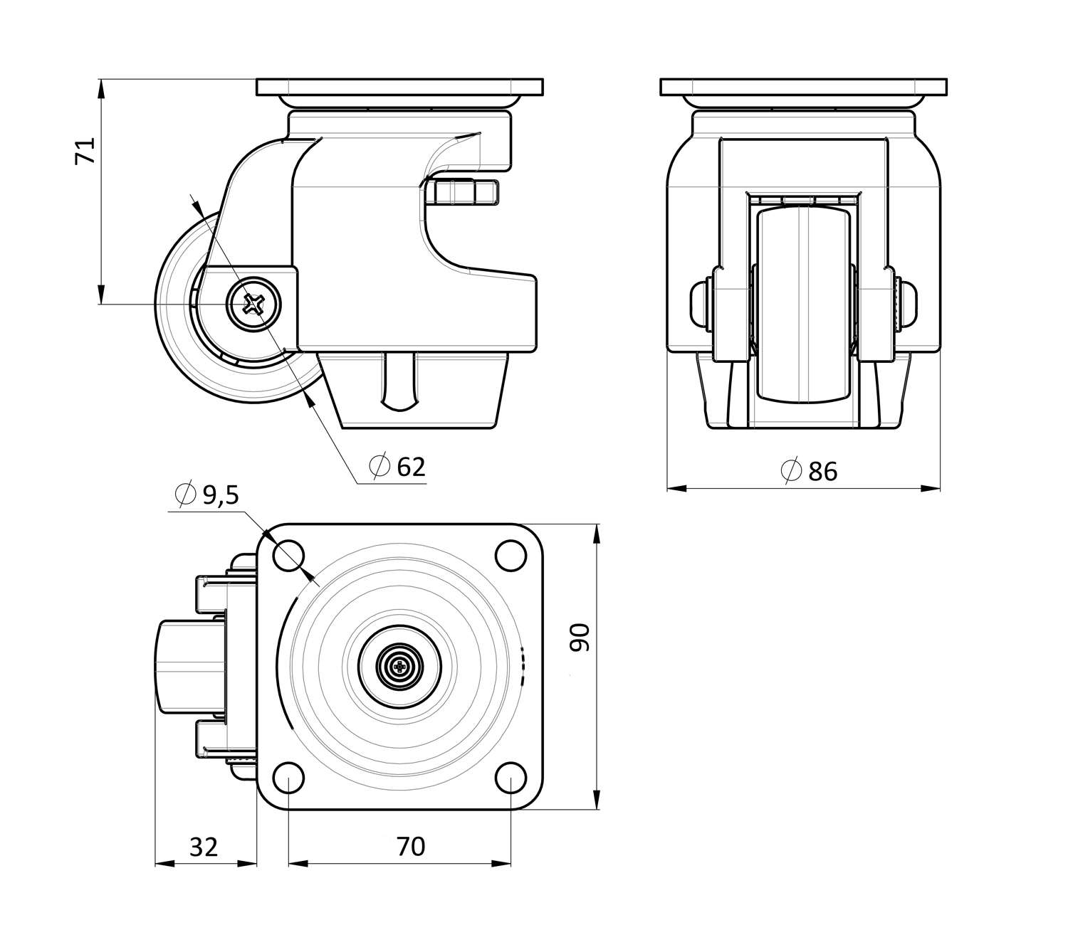 Колесо самоустанавливающееся H 102 мм, D 62 мм с платформойКолесо самоустанавливающееся H 102 мм, D 62 мм с платформой