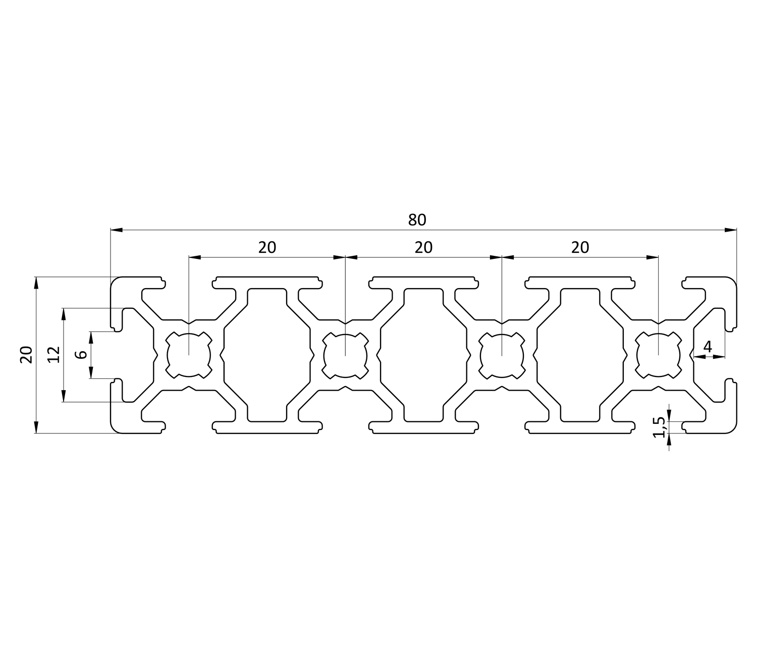 Алюминиевый конструкционный профиль 20x80 без покрытияАлюминиевый конструкционный профиль 20x80 без покрытия