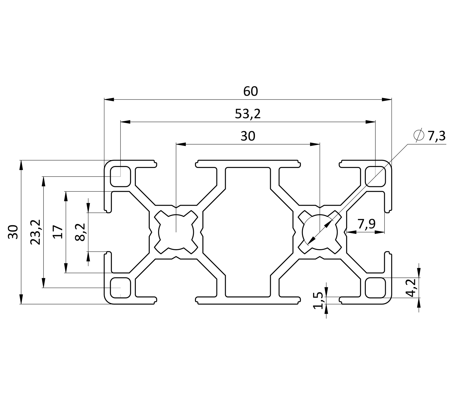 Алюминиевый конструкционный профиль 30x60 без покрытияАлюминиевый конструкционный профиль 30x60 без покрытия