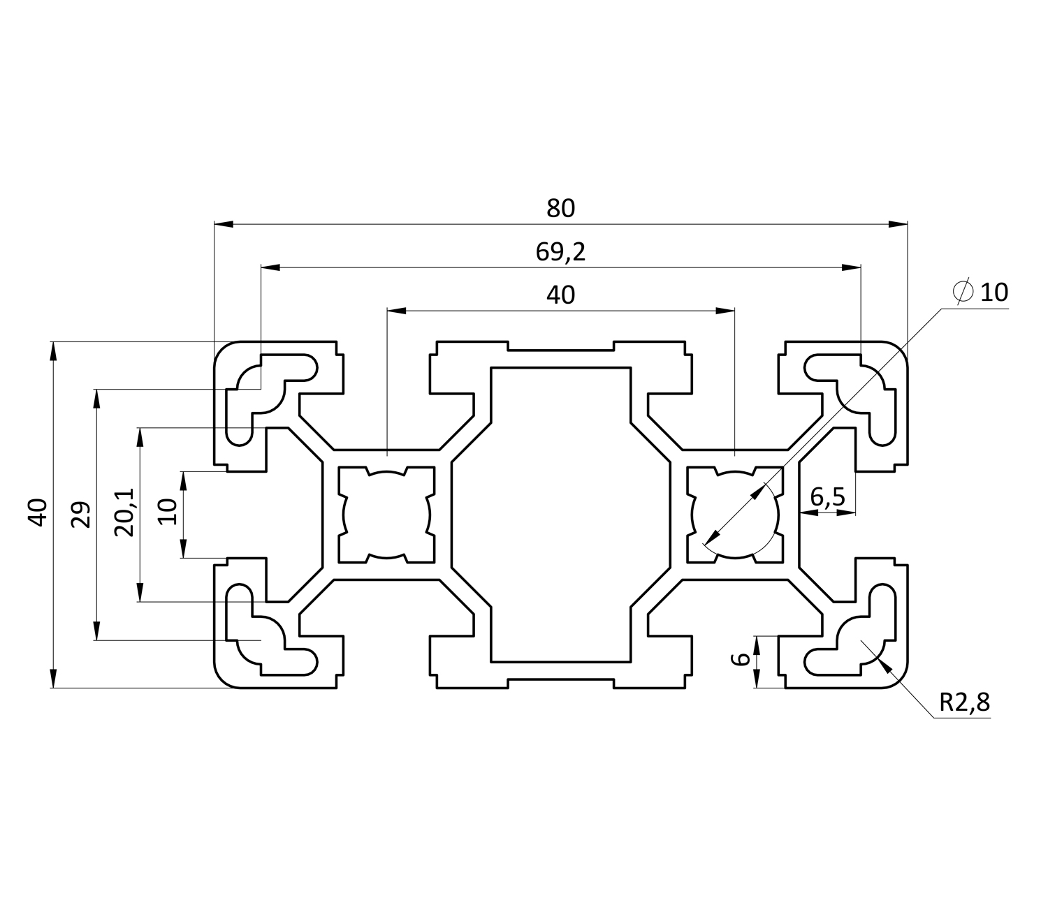 Алюминиевый конструкционный профиль 40х80 без покрытияАлюминиевый конструкционный профиль 40х80 без покрытия