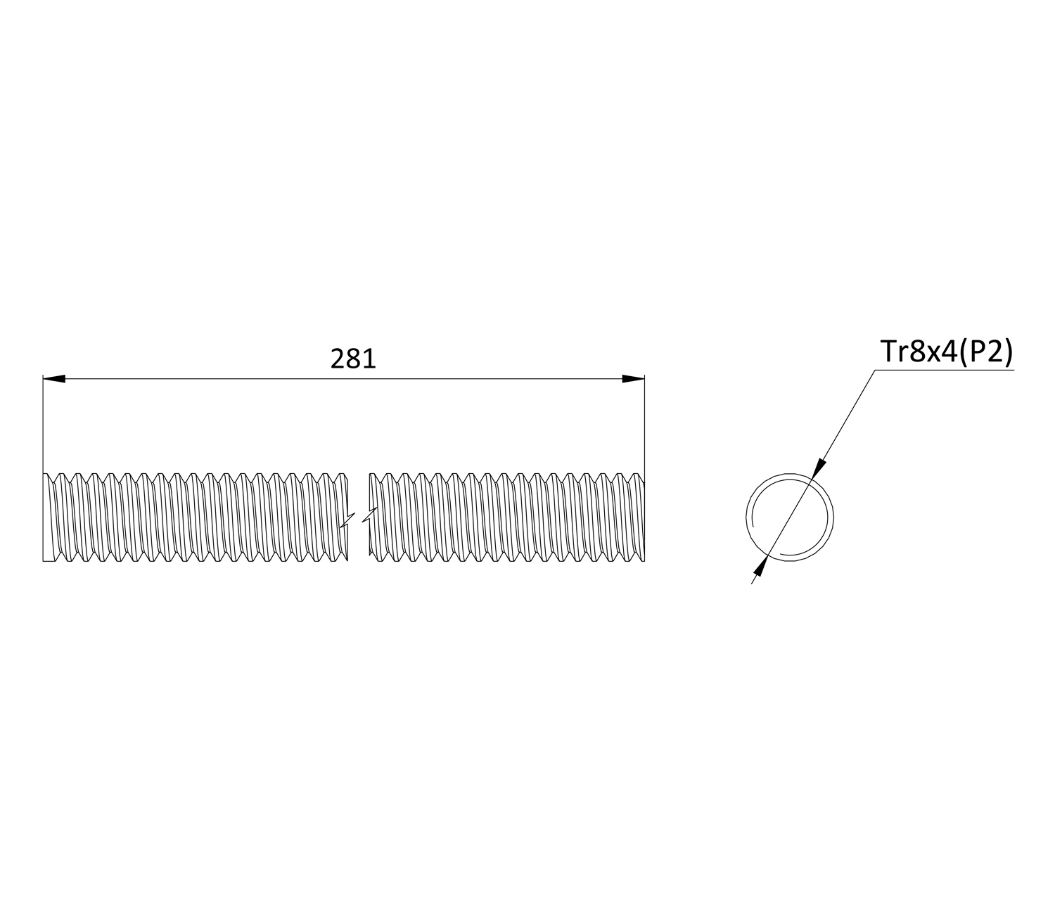 Трапецеидальный винт 8х281 мм, 2-х заходный, шаг 2 ммТрапецеидальный винт 8х281 мм, 2-х заходный, шаг 2 мм