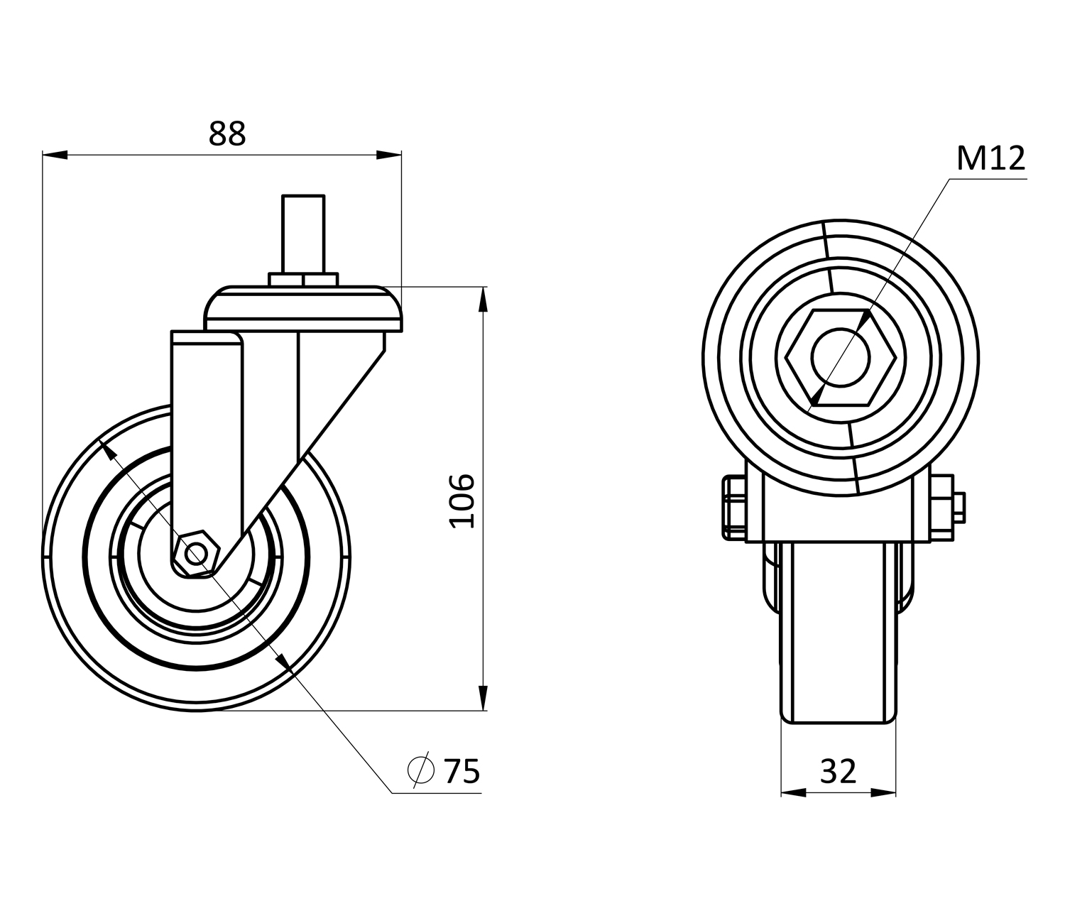 Колесо поворотное 75 мм M12, сероеКолесо поворотное 75 мм M12, серое