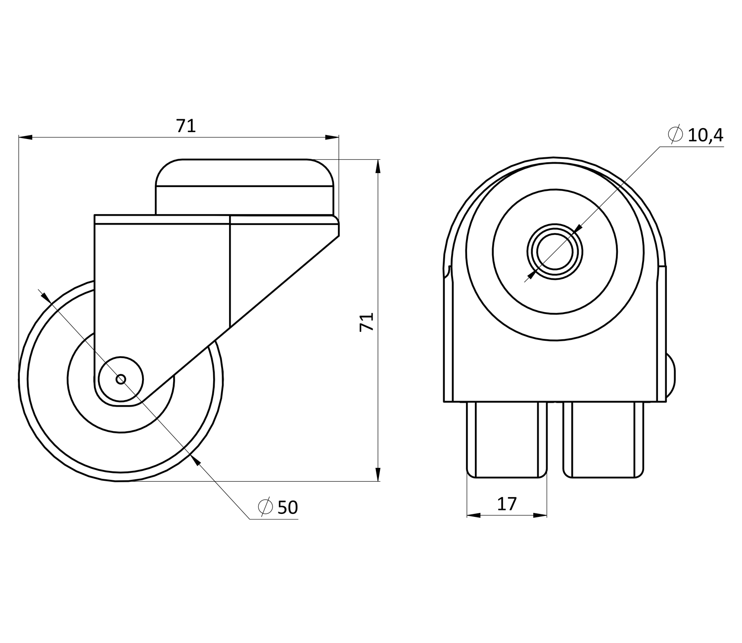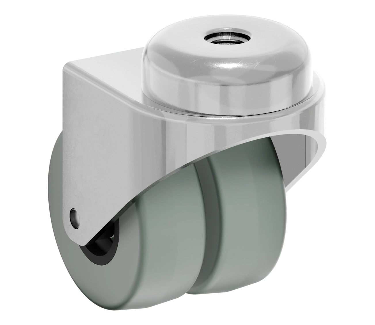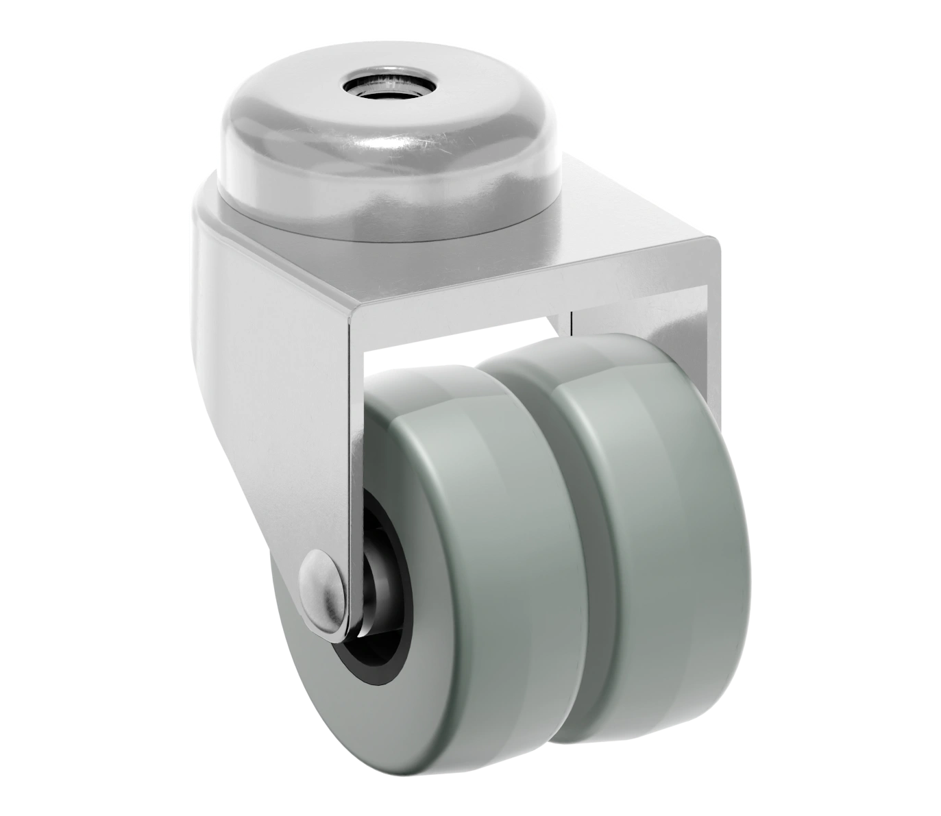Сдвоенный ролик поворотный средней грузоподъемностью, имеет крепление под болт. Используется при производстве конструкций из алюминиевого профиля, которые должны обладать возможностью перемещения их в пространстве, такие как промышленная и рабочая мебель, тележки, различные агрегаты, торговое оборудование