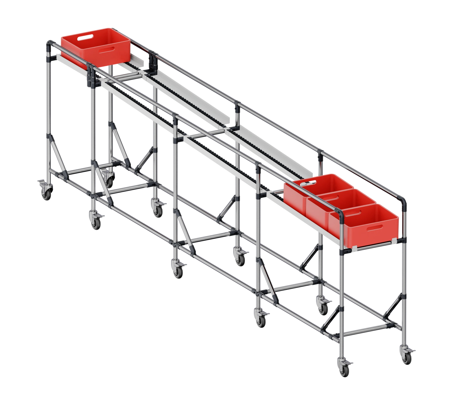 Мобильный гравитационный модуль для организации конвейерных линий. Конструкция из алюминиевой трубы со стальными кронштейнами оснащена роликовыми направляющими для перемещения продукции в транспортировочных ящиках. Колеса с тормозной системой обеспечивают плавное перемещение и надежную фиксацию. Модуль может использоваться автономно или объединяться в протяженные линии.