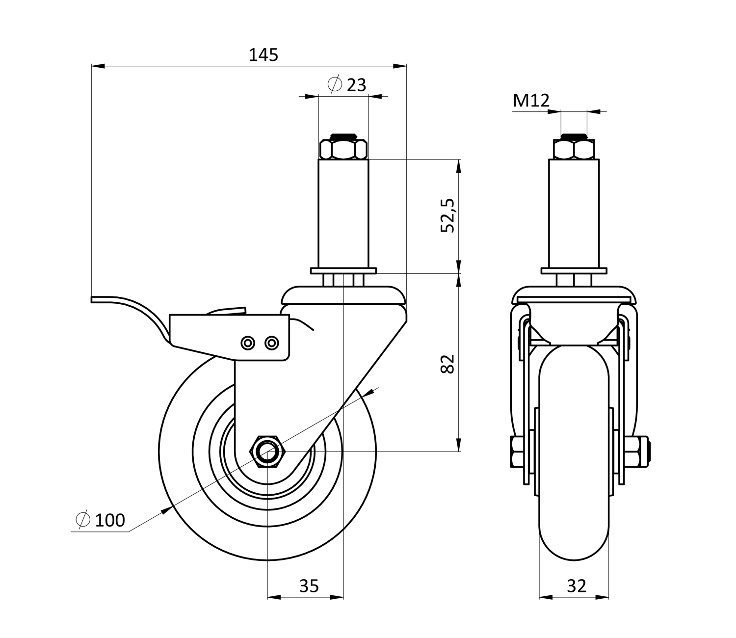 Ролик поворотный D100 с тормозом втулка D23Ролик поворотный D100 с тормозом втулка D23