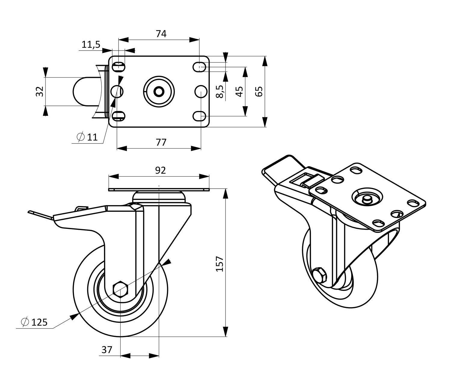Ролик поворотный с тормозом D125Ролик поворотный с тормозом D125