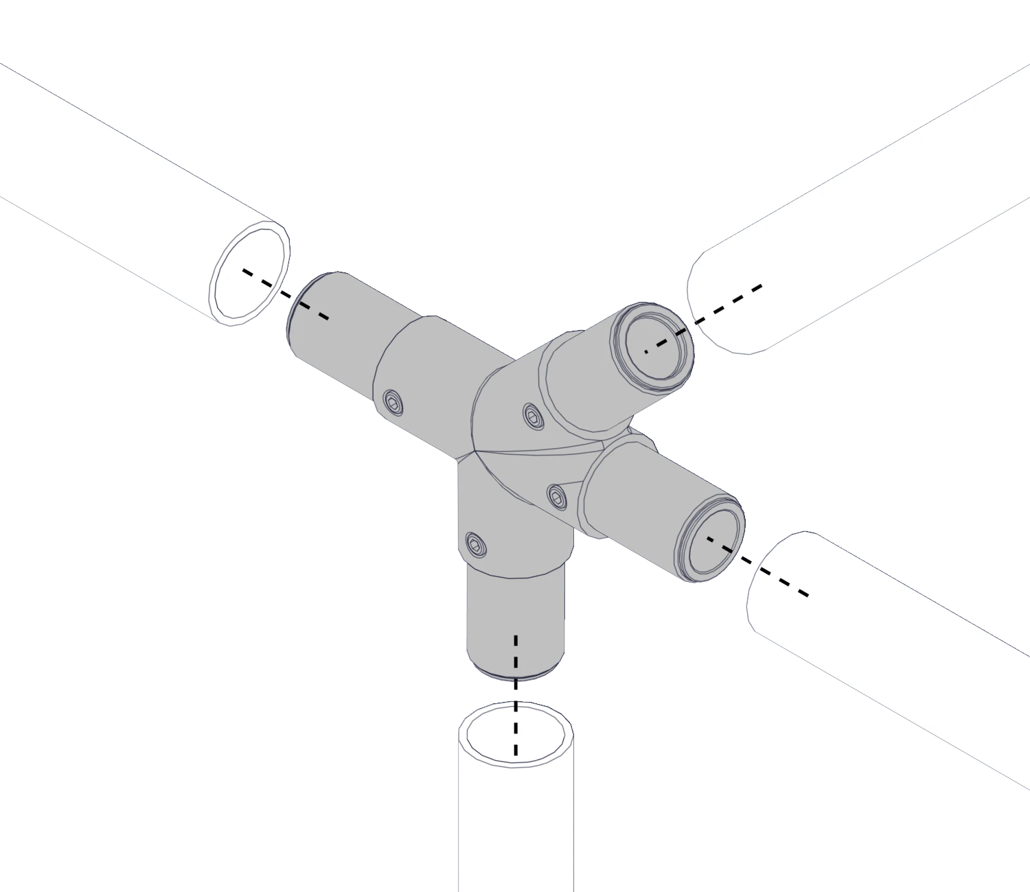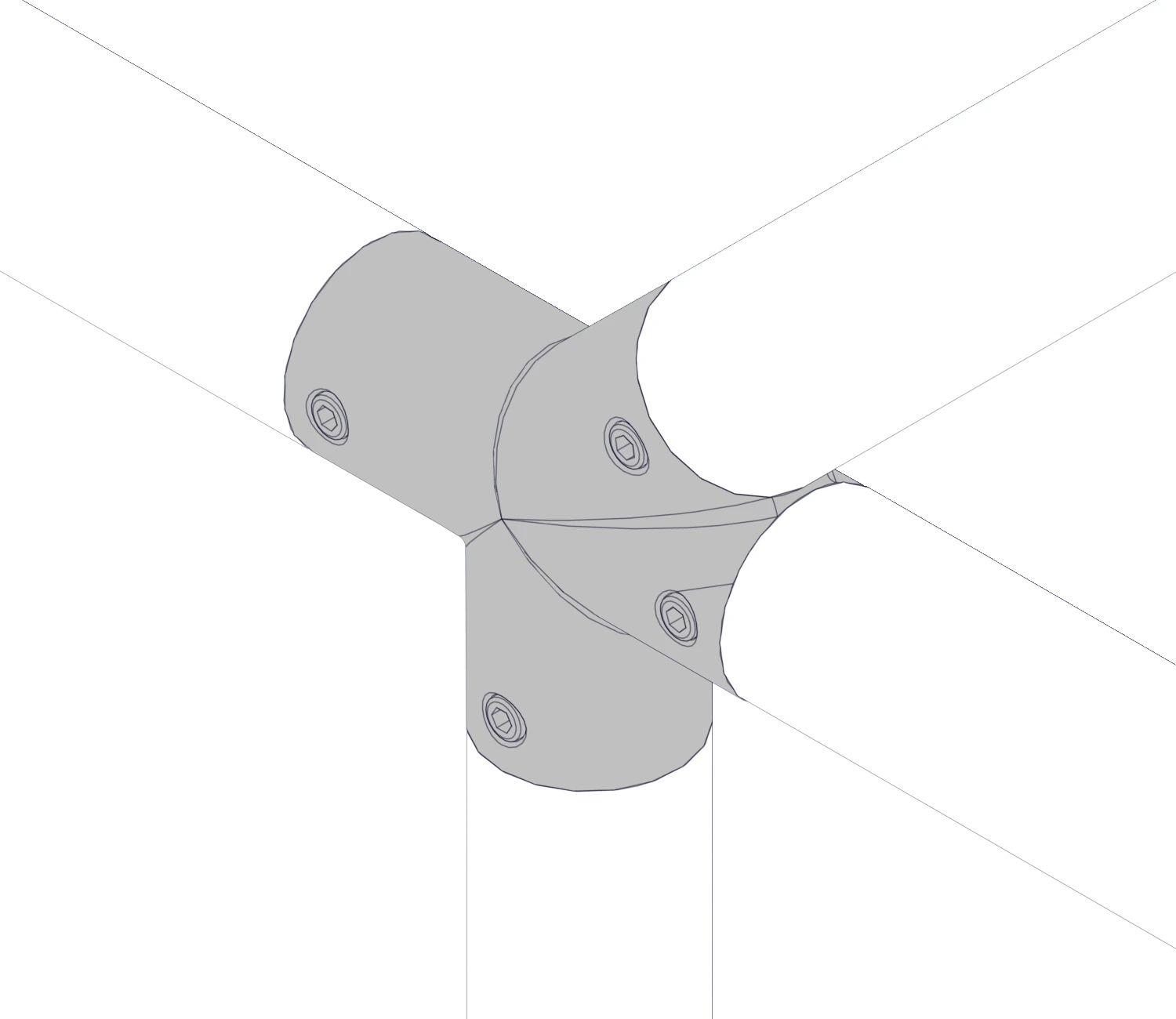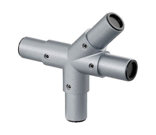 Соединяет трубный профиль с четырех сторон, один угол при этом образует соединение под 45 градусов в таких элементах лестничной конструкции как поручни, ограждения.
