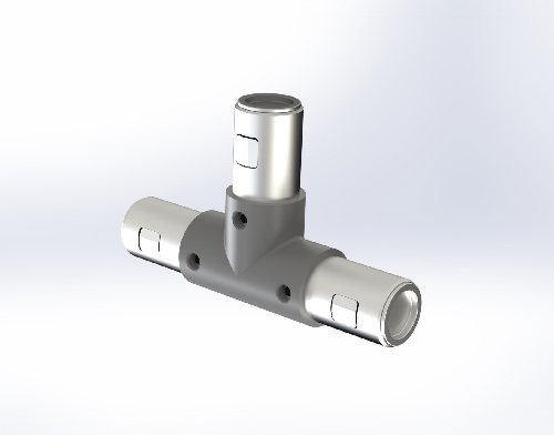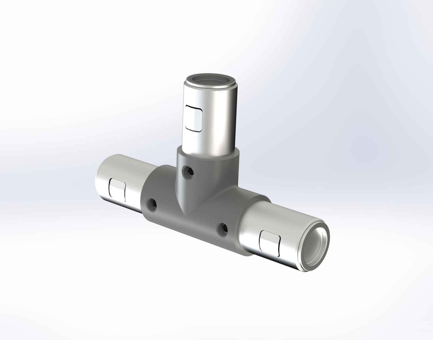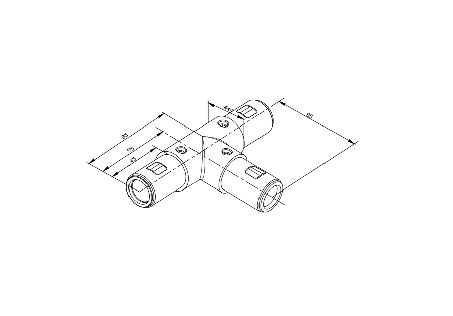 Т-соединитель D40 - элемент линейки соединителей лестничной системы Алюмика, используемый совместно с алюминиевым трубным профилем D40 мм.