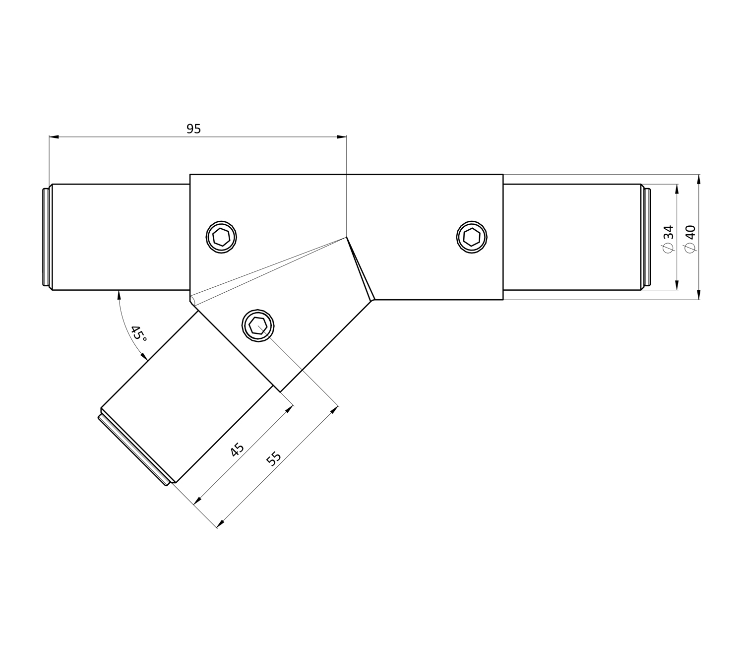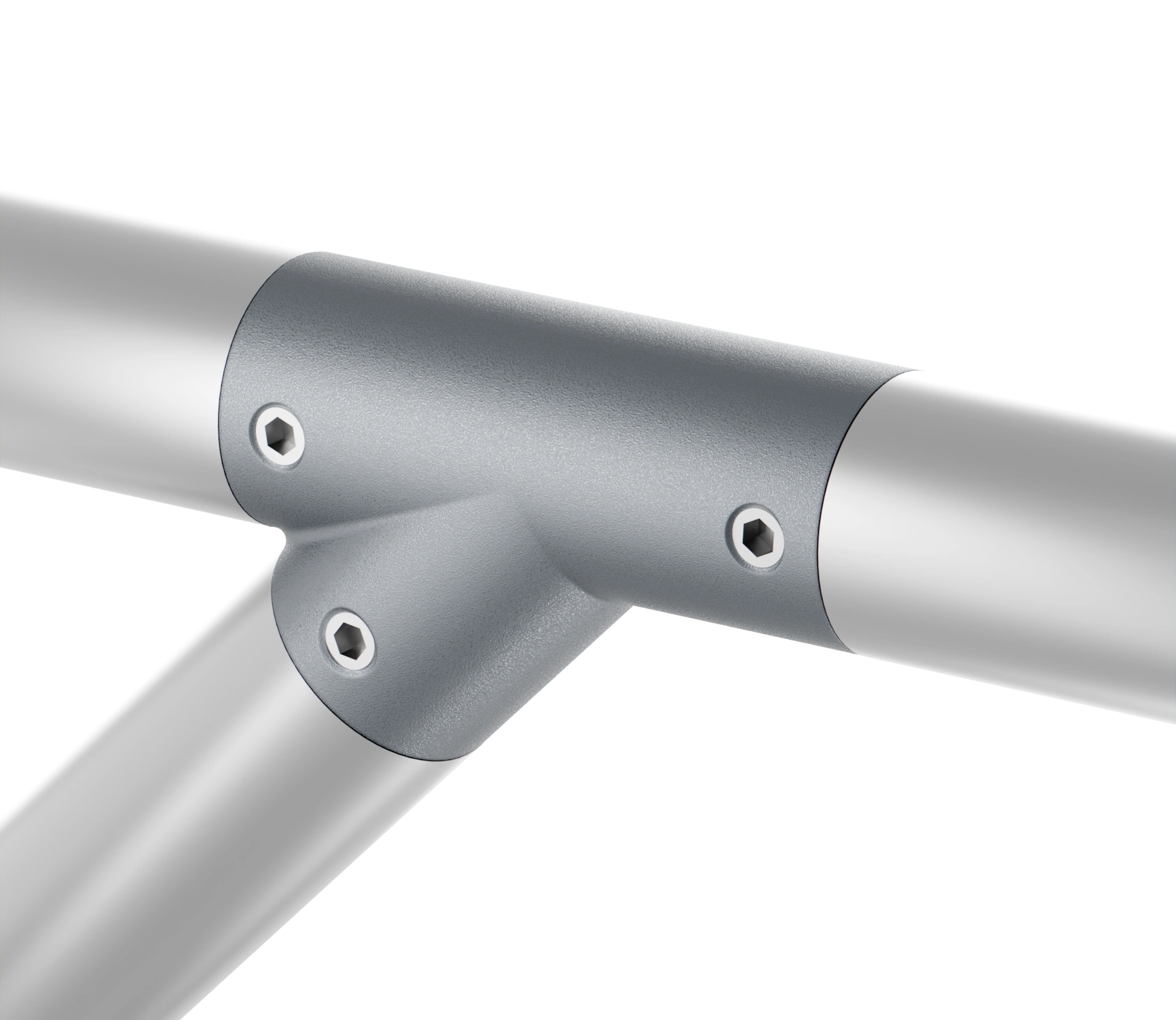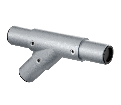 Соединяет трубный профиль с трех сторон, один угол при этом образует соединение под 45 градусов в таких элементах лестничной конструкции как поручни, ограждения.