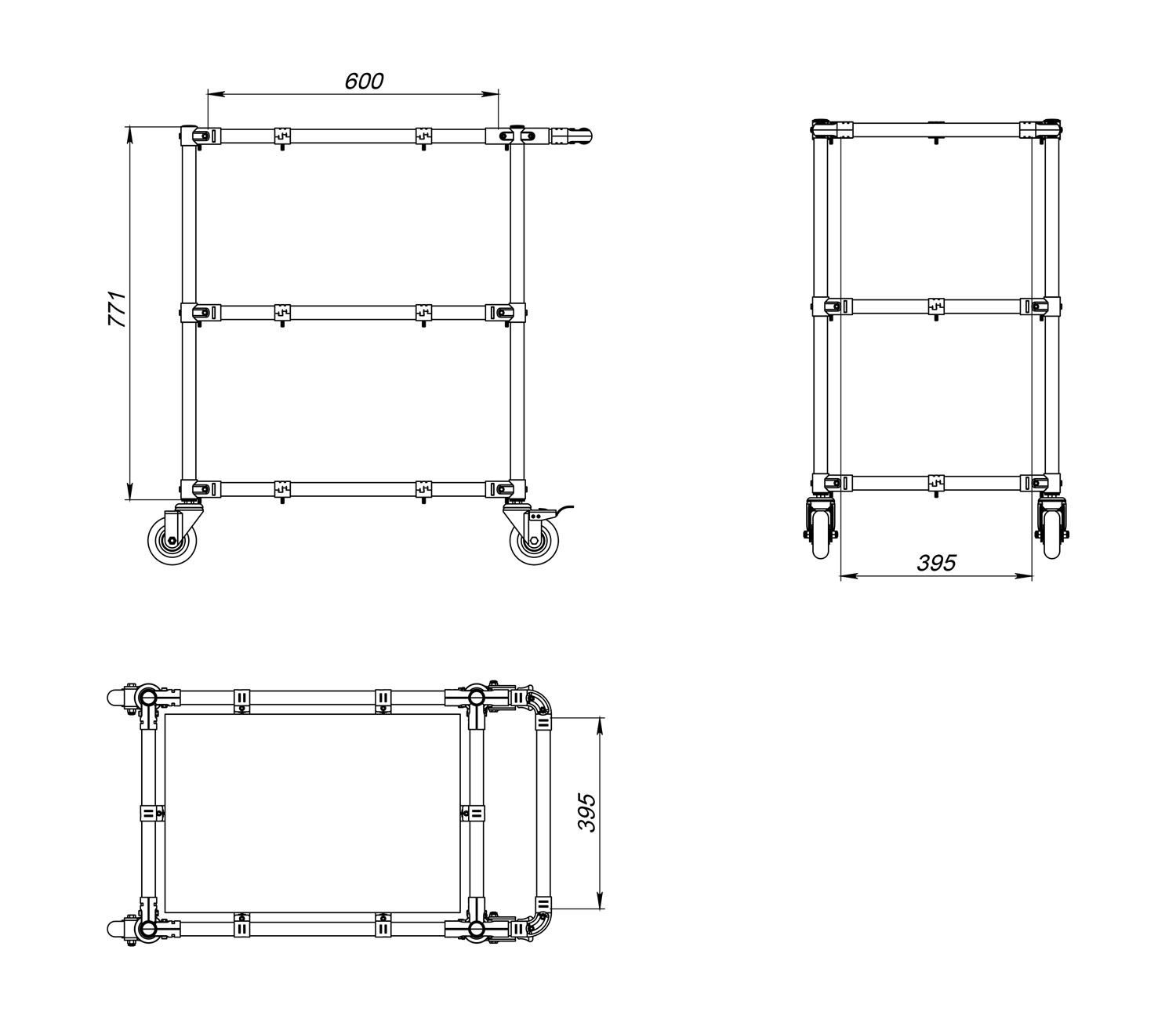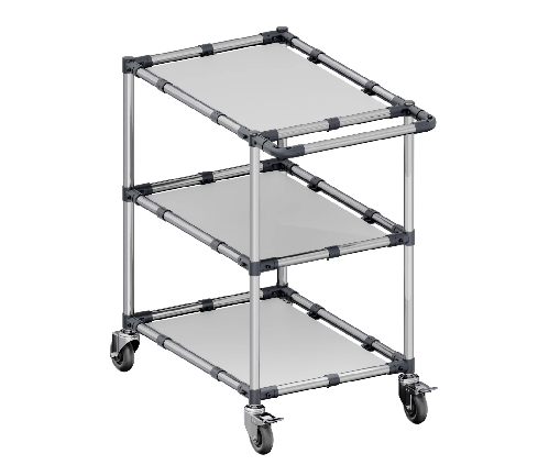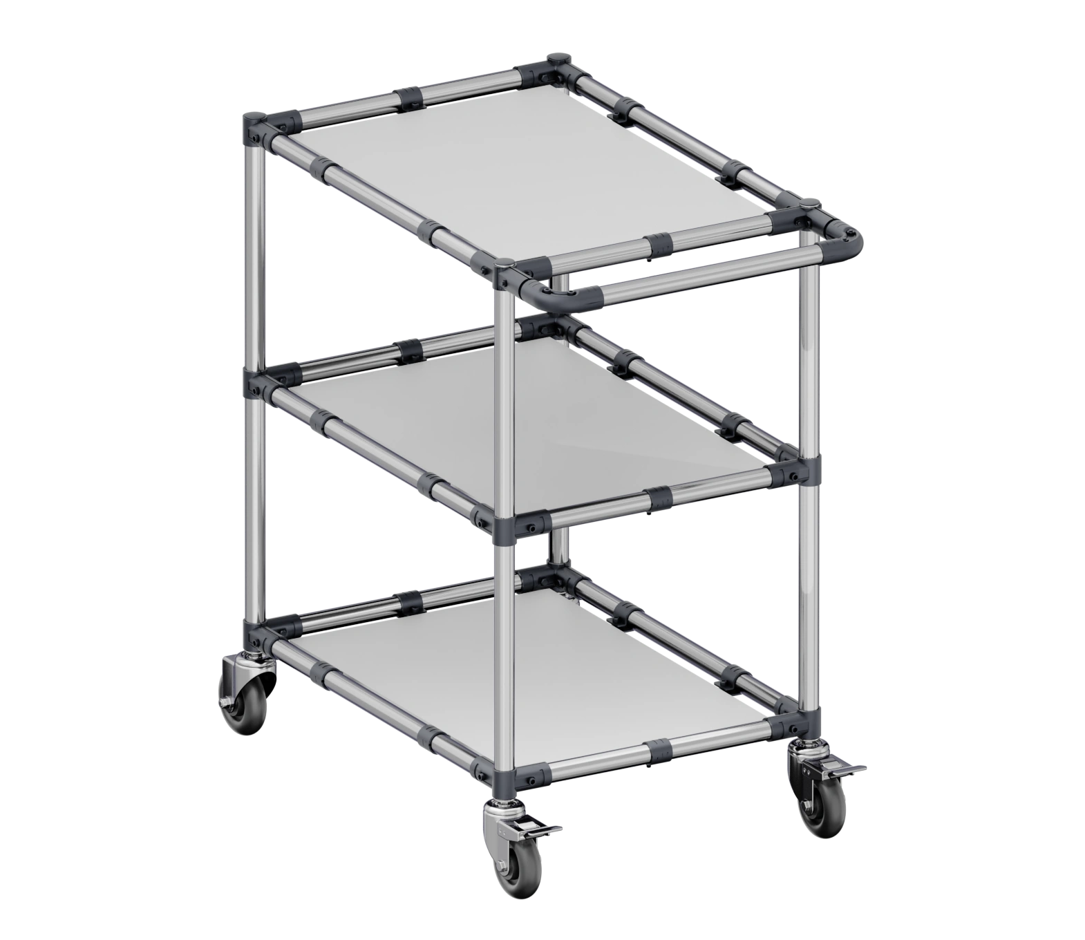 Мобильная тележка с трехполочной конструкцией грузоподъемностью 100 кг для внутрипроизводственной логистики. Каркас из алюминиевой трубы с соединительными кронштейнами обеспечивает устойчивость при транспортировке деталей и инструмента. Оснащена четырьмя колесами, включая два с тормозной системой, для маневренного перемещения и фиксации. Эргономичная ручка обеспечивает комфортное управление.