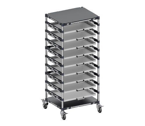Мобильный стеллаж с 9 ящиками на шариковых направляющих общей грузоподъемностью 100 кг. Конструкция из алюминиевого профиля и стальных кронштейнов обеспечивает устойчивость при транспортировке. Каждый ящик оборудован эргономичной ручкой для быстрого доступа к содержимому. Оснащен четырьмя колесами с тормозной системой для перемещения по производственной территории.