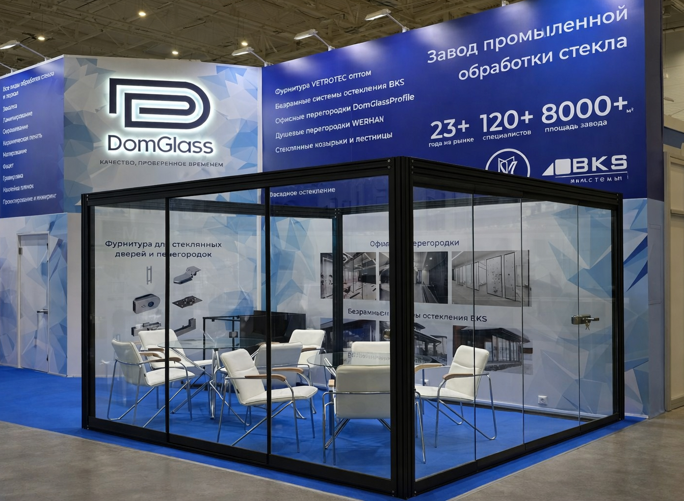 Стеклянная переговорная на выставке «Мир стекла-2026» из профиля Алюмика