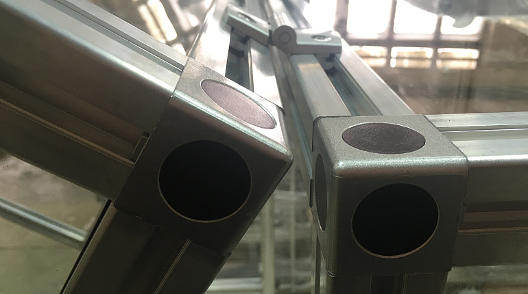 Особого внимания заслуживает система соединений. Трехсторонний угловой соединитель стал ключевым элементом каркаса, позволяя соединять три отрезка профиля одновременно. Его преимущества: