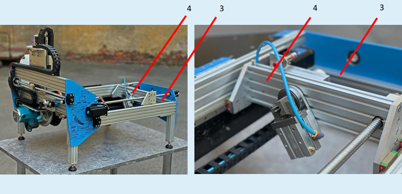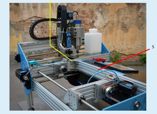 Отрезок 0,662 м - 1 шт (5) служит боковой стенкой устройство ЧПУ станка – блока электроники, обеспечивающим питание рабочих органов станка и управлении ими. Также на пазах данного отрезка закреплена левая рельсовая направляющая оси X. Сам же профиль с передней стороны лежит на отрезке (3), а с обратной соединен с отрезком (6) через сухари М4 и угловых соединителей 20x40, 20 серия, тип 2.